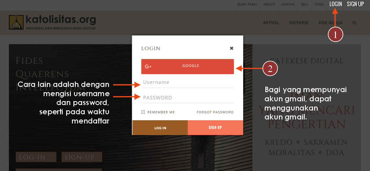 Bagi Anda yang telah mendaftarkan (SIGN UP) diri Anda di katolisitas, maka yang perlu Anda lakukan adalah melakukan LOGIN, dengan cara klik "LOGIN" di pojok kanan atas.